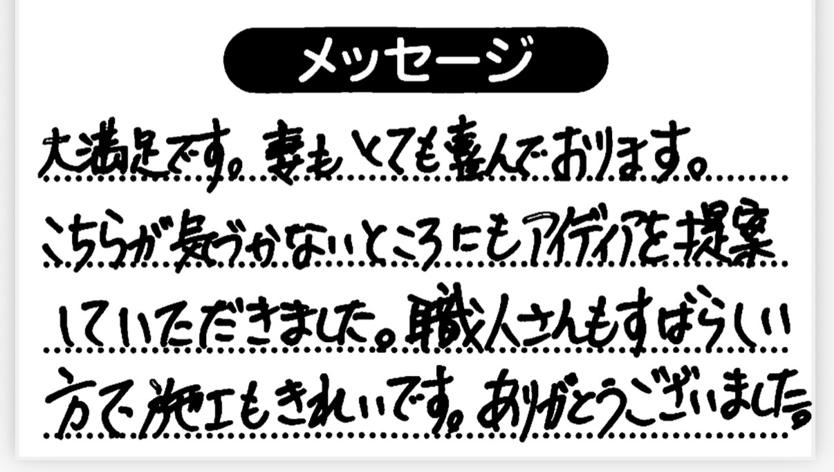 大満足です。妻もとても喜んでおります。こちらが気づかないところにもアイディアを提案していただきました。職人さんもすばらしい方で施工もきれいです。ありがとうございました。